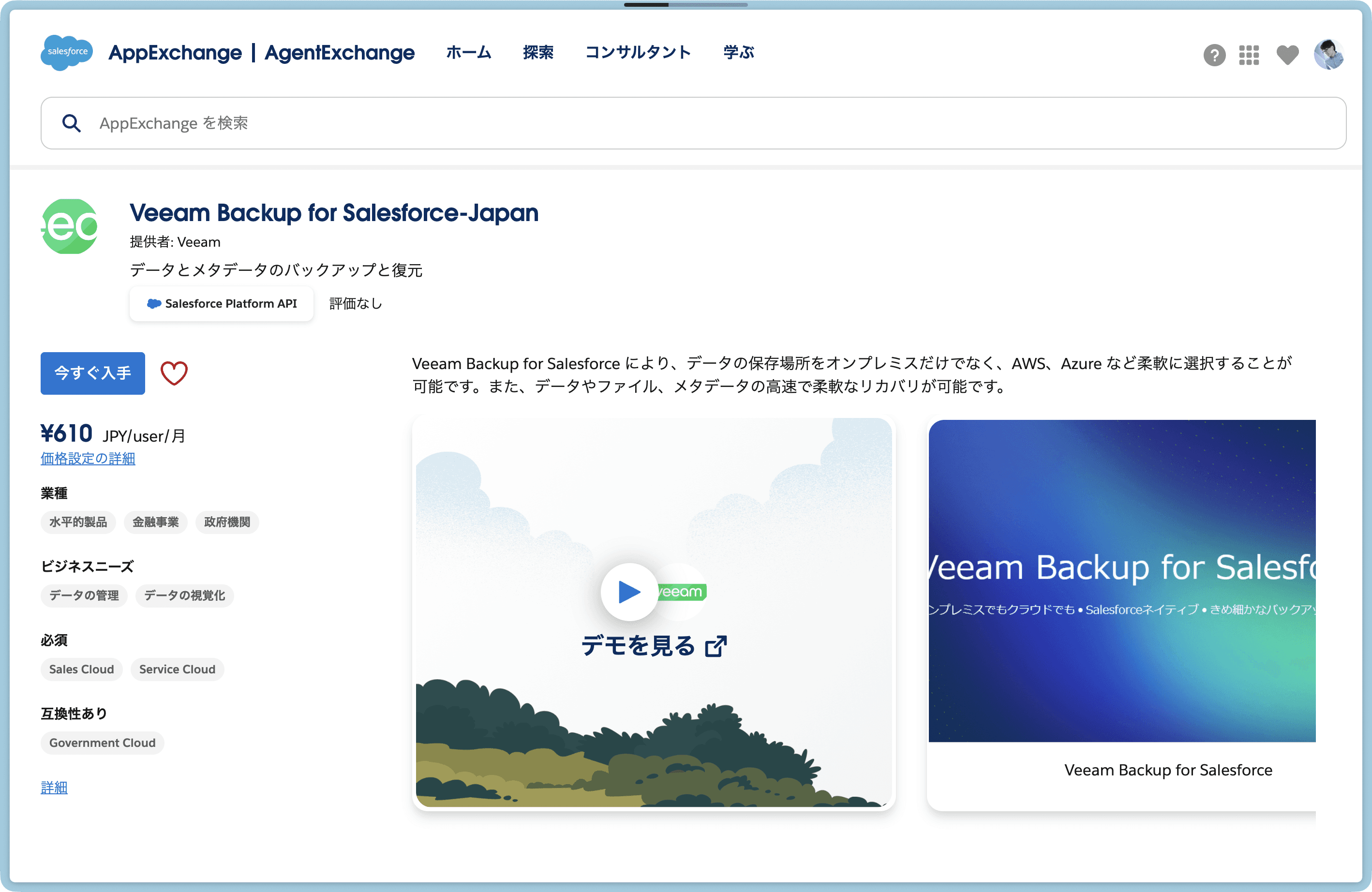 AppExchangeには、AvePoint(1日最大4回の自動バックアップ対応)、Veeam(オンプレミスやAWS・Azureなど保存先を柔軟に選択可能)など、複数のソリューションが提供されています。それぞれ特徴が異なるため、自社のデータ量、バックアップ頻度の要件、予算に応じて比較検討することをおすすめします。